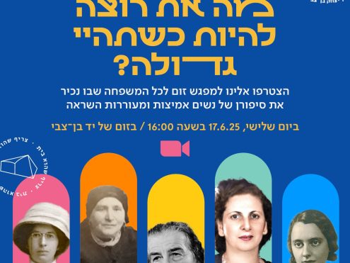 הצטרפו אלינו למפגש זום לכל המשפחה שבו נכיר את סיפורן של נשים אמיצות ומעוררות השראה, שהיו לא רק אימהות וסבתות, אלא גם גיבורות אמיתיות: שולמית קישיק-כהן, רחל ינאית בן-צבי, הלנה כגן, קרישה ברמן, לאה גולדברג ועוד.