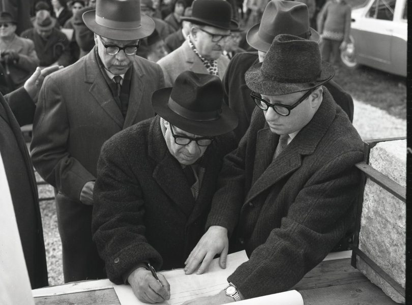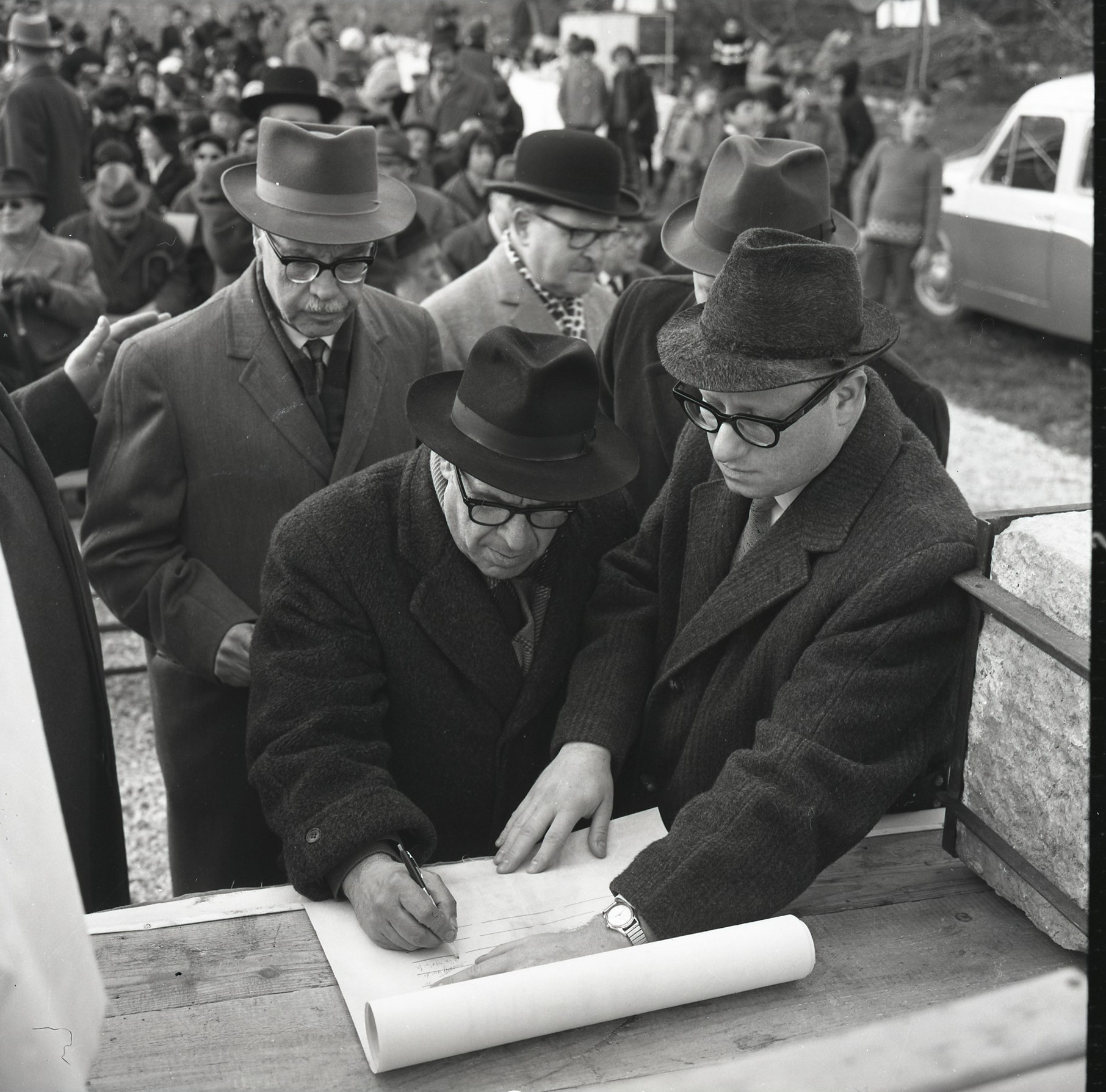 את שתי התמונות גילתה חוה בנפרד. כשהניחה אותן זו ליד זו – הבינה שמדובר באותו טקס, אך היא לא הבינה באיזה טקס מדובר. היא גם לא הצליחה למצוא כל תיעוד אחר לאירוע הזה. היכן נערך? על מה חתמו המכובדים? השאלות נשארו בלי מענה עד שהיא נתקלה בהמשך העבודה בתצלום של לוח מודעות ירושלמי ועליו מודעה של עיריית ירושלים בחתימת ראש העיר טדי קולק: